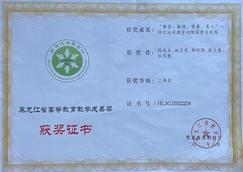 以孙成业为项目主持人,冰雪体育教学团队为成员的科研项目《教会、勤练、常赛、育人一体化冰球教学与训练探索与实践》获得黑龙江省高等学校教学成果二等奖,实现教学成果省级获奖零的突破,近些年,金年会冰雪体育运动取得突出的成绩,冰雪体育运动位列全国先进行列。