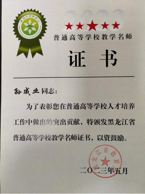 2023年5月黑龙江省教育厅组织黑龙江省教学名师评选,金年会教师孙成业荣获黑龙江省普通高等学校教学名师。