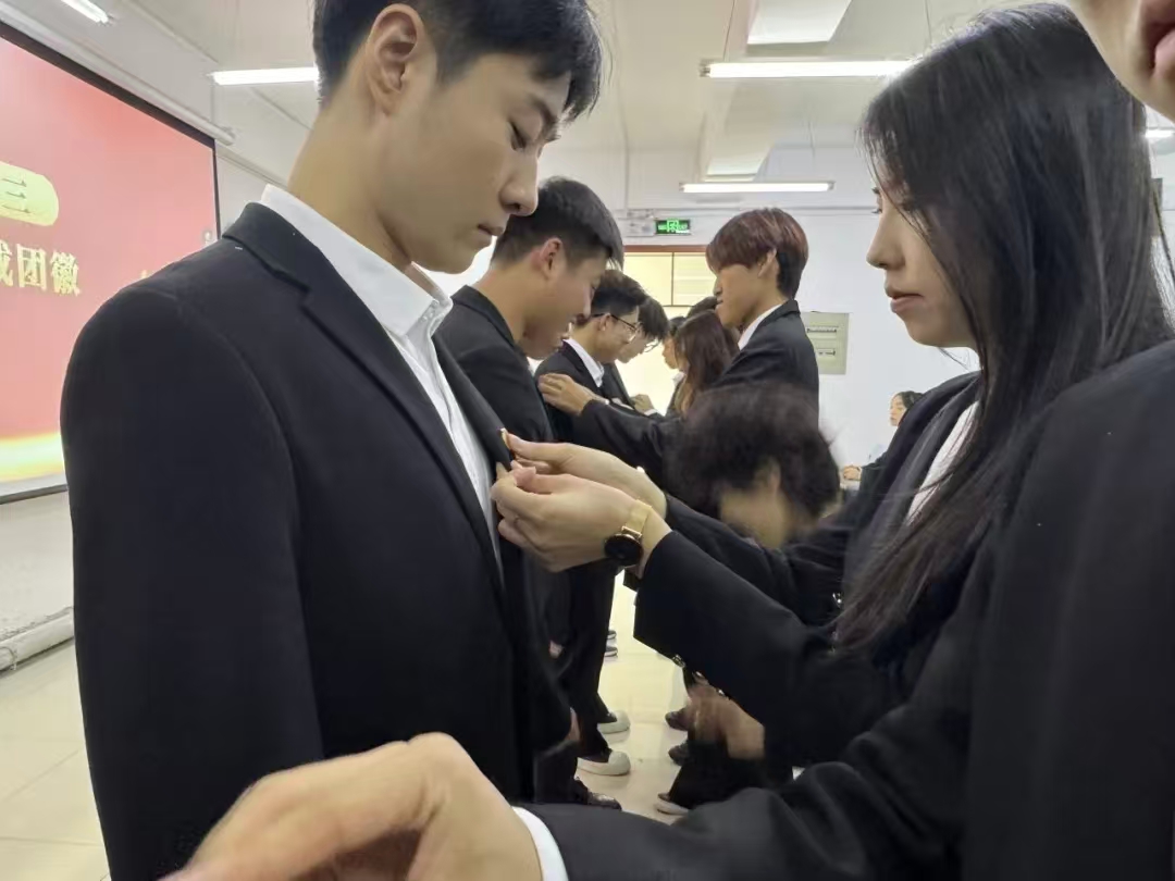 随后,老团员代表为新团员佩戴团徽,这枚小小的徽章,不仅是身份的象征,更是一份“强国有我”的责任与担当。佩戴完毕后,它提醒着新团员们,时刻牢记团员的使命与担当,以实际行动展现团员的风采,让团徽在胸前永远闪耀光芒。