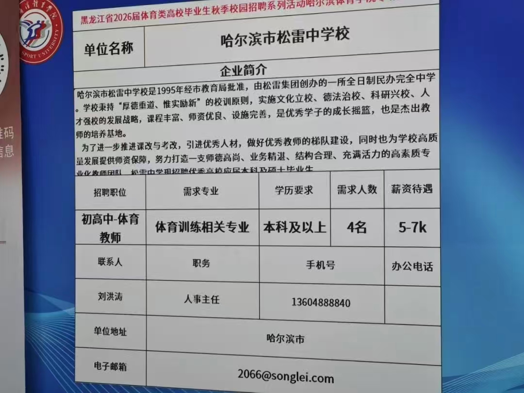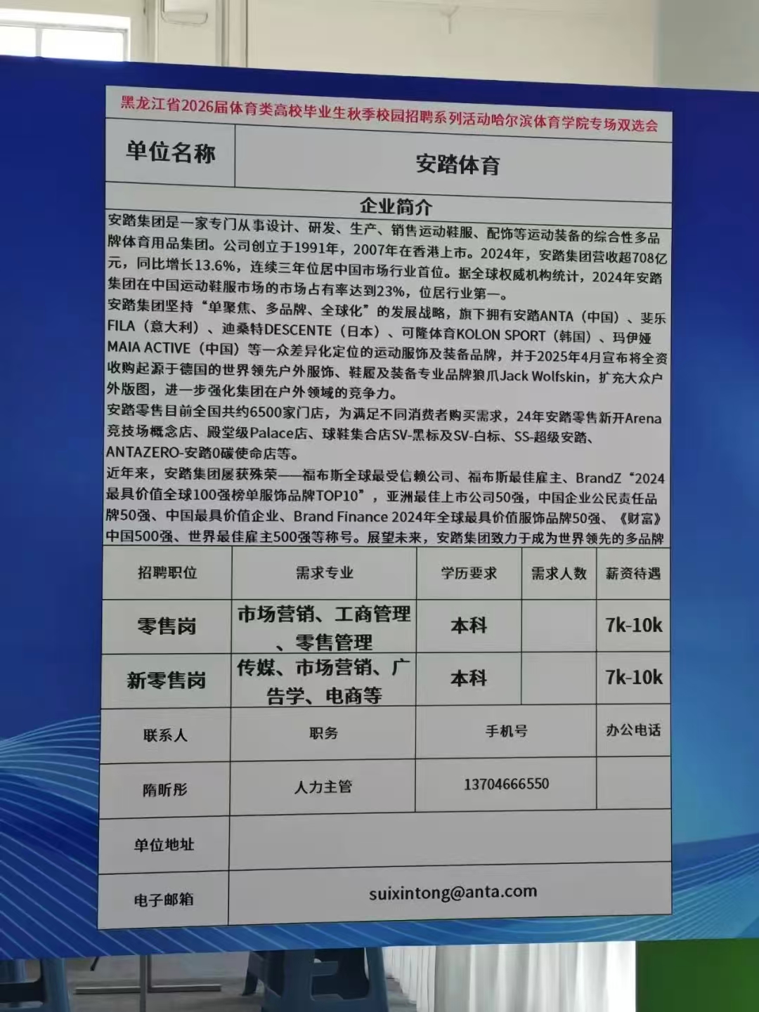为深入对接优质企业资源,开拓更多就业岗位,全力促进金年会2026届毕业生更加充分、更高质量就业,近日,金年会诚信信誉至上招生就业处冯笑处长与金年会副书记邹积恒专程前往哈尔滨参加黑龙江省2026届体育类高校毕业生秋季校园招聘系列活动哈尔滨金年会jinnianhuicom专场招聘会。